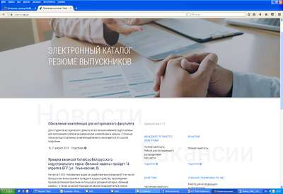 The resource is user-friendly and consists of two sections Resume and Documents. The first section unites the resumes of graduates of the faculties and educational institutions of BSU. The database is updated daily. All the resumes contain information about the acquired professional and computer skills, a description of scientific activities, the level of proficiency in foreign languages, as well as additional information about hobbies.
