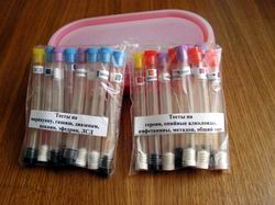 - The test for a certain drug represents a transparent reactionary case with the ampoules containing reagents, at contact with which narcotics cause painting of the solution, characteristic for the given drug.